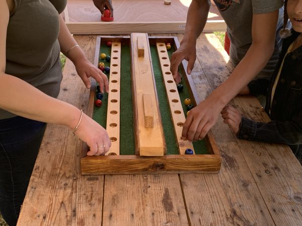 Se joue à trois, l’un des trois forme une ligne avec des billes de couleur au centre puis cache la ligne, les deux conccurants s’affrontent en placant des billes de couleur sur une ligne de chaque coté du jeu
